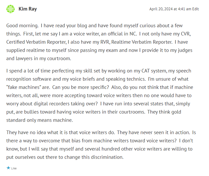 Backstory. In September of 2017, Tori Pittman posted in my “Why I Love Court” Reporting Facebook group about voice writing and how it should be accepted everywhere. At the time, I didn’t know anything about voice writing and CA didn’t allow it, so I never bothered to research more about it. It was irrelevant to me, and reporters are busy enough pumping transcripts out. She continued to debate the merits on my group, and I just asked her politely to bring that debate to a bigger stage where she could actually impact the change that she was seeking. My group was small and the focus was different. The WILC group was created because my alma mater school told me they lost 3 students because they went to a FB vent site for court reporters. We couldn’t have our prospective students dropping out because of all the negative gripes from working reporters. We love our career, but every career has legitimate gripes. So I created a positive FB group that the schools could send their students where they weren’t in danger of dropping out, so the last thing I needed was a debate or controversy. The schools were watching. I told her that my group wasn’t the place and that I had no opinion one way or another. But I advised her that if she really wanted to change the laws in CA, she needed to start at the top, not the bottom. I openly admitted I was just a working reporter on the front lines with no power, no control, no influence, nothing. She was barking up the wrong tree. I told her the DRA and CCRA would NEVER let her idea get passed them, the gatekeepers. She should go above them to the CRB, the arbiter, pitch it to them, and let them decide. Months later, she was on the agenda, flew to CA, made her pitch and it was approved. A day later, the DRA and CCRA were on it and at the next CRB meeting it was tabled indefinitely, with all their excuses about how their voices would be distracting during a machine test, making the logistics impossible and they’d have to work out the details, which meant never. You can thank people like Stephanie Whitehead, a San Diego reporter (machine), who spent the next almost decade educating reporters up and down the state on the merits of voice writing. She helped get the first school in CA to start a voice writing program. Today, 2024, all 7 reporting schools in CA offer voice writing. She has turned the state into a fan of voice writers, and anyone who speaks a negative word is immediately shot down, and educated. I’ve had two voice writers sit out with me in court recently and we’ve educated the attorneys and judges about voice writing and how it’s just as good as machine writing (with one big difference, which I’ll get into later). Now, Los Angeles Superior Court, the largest court in the United States (and probably the word), has voice writers. I don’t know the exact amount. Since California’s population of court reporters is about 2/3 of the country’s total reporters, I can envision the entire country being accepting of voice writing in the very near future!