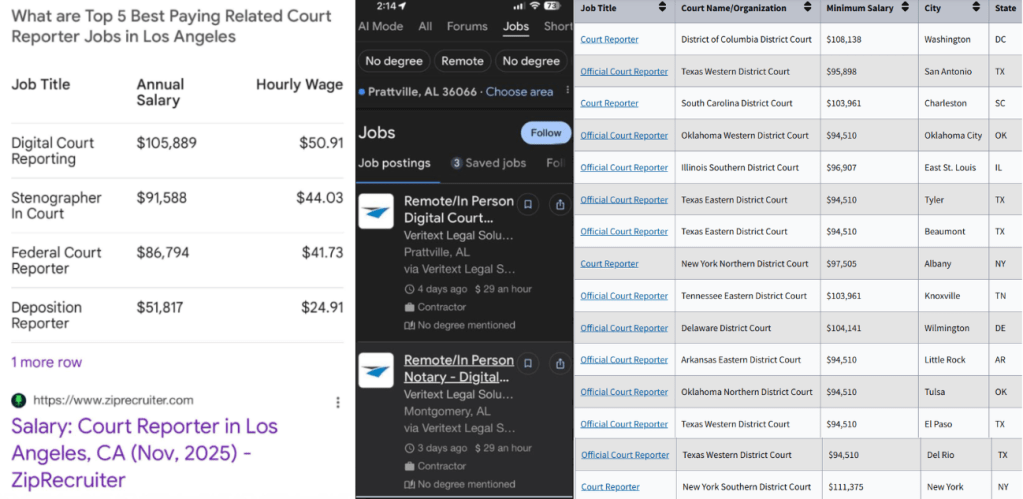 This is not just a moment of sticker shock. It is a case study in how mischaracterized data, algorithmically generated content, and surface-level job aggregation distort an already fragile ecosystem. The court reporting profession, long grounded in skill, certification, and legal accountability, now finds itself competing with seductive but misleading narratives suggesting that minimally trained digital recorders are not only equivalent, but more financially rewarded.