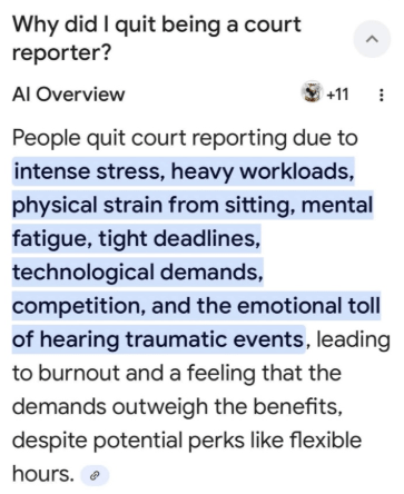 The AI summary also treats “technological demands” as a reason people quit, as though learning and evolving were new burdens imposed on an otherwise static field. Court reporters have always adapted to technology. From manual machines to computerized steno, from paper notes to realtime feeds, from in-person proceedings to remote platforms, this profession has survived precisely because its practitioners are resilient, curious, and technically adept. Those who struggle with that reality self-select out early. Those who thrive stay for life.