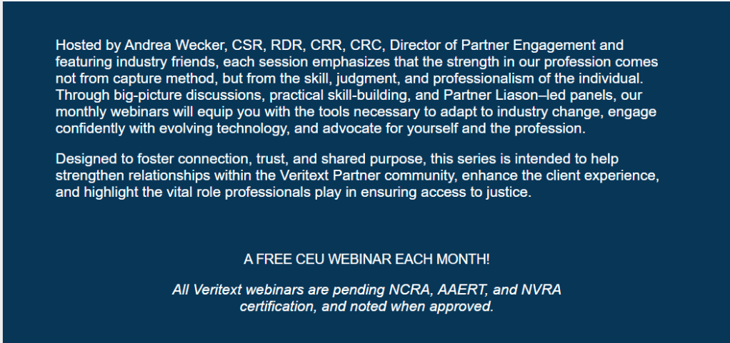 Yesterday, Dec 23, 2025, Veritext circulated a polished email inviting reporters, videographers, transcriptionists, and “industry partners” to participate in a year-long series of complimentary CEU webinars. On its face, the messaging is reassuring—language about professionalism, ethics, adaptability, and “the human in the room” is designed to sound unifying and forward-looking. But when a corporation whose core business strategy depends on replacing licensed court reporters positions itself as the educator, convener, and ethical authority for the profession, that messaging deserves close scrutiny. Education is never neutral when it is funded, framed, and curated by a party with a direct financial stake in the outcome.