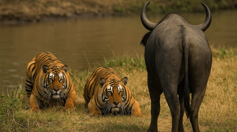 In the wild, a tiger ambush is a study in precision. The predator waits, calculates distance and timing, and commits only when the odds are overwhelming. A single misstep—a snapped twig, a mistimed lunge, a shift in the wind—and the balance reverses. The buffalo does not need to outrun the tiger. It only needs to survive the first mistake. When that happens, the tiger pays the price.