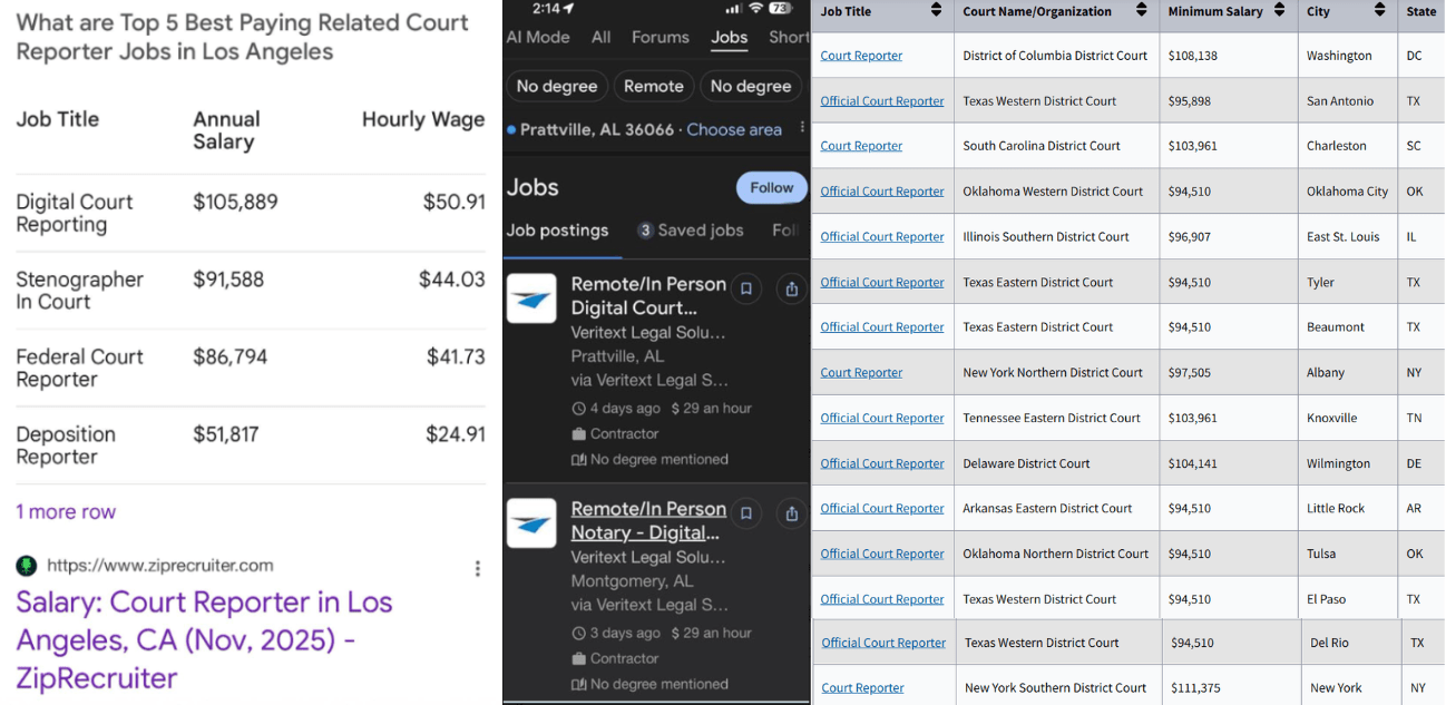 A viral wage graphic now claims digital court reporters in Los Angeles earn more than licensed stenographers and federal officials. The figures collapse under scrutiny, revealing a dangerous distortion of how court reporting is valued and understood. When passive recording is framed as more lucrative than producing the certified legal record, the profession’s integrity is compromised and the public misled about justice, skill, and accountability.