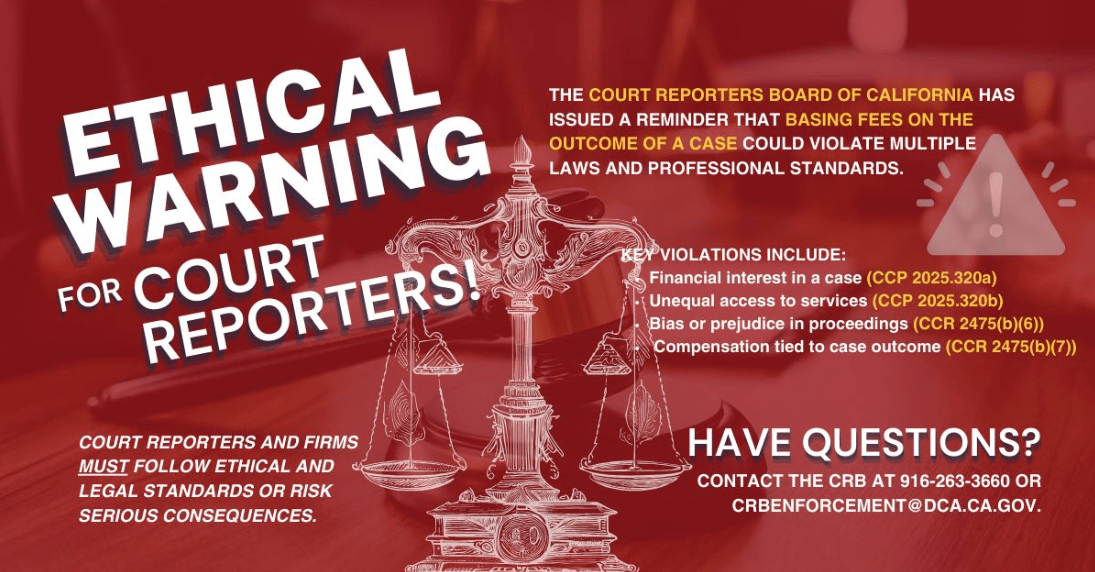 Court reporting firms must uphold neutrality, yet some offer “no payment until settlement” to clients while demanding immediate payment from opponents. This raises ethical concerns and may violate California law. The Court Reporters Board of California warns that such practices compromise impartiality and could result in regulatory action. Maintaining fair payment policies is essential to preserving trust and integrity in legal proceedings.